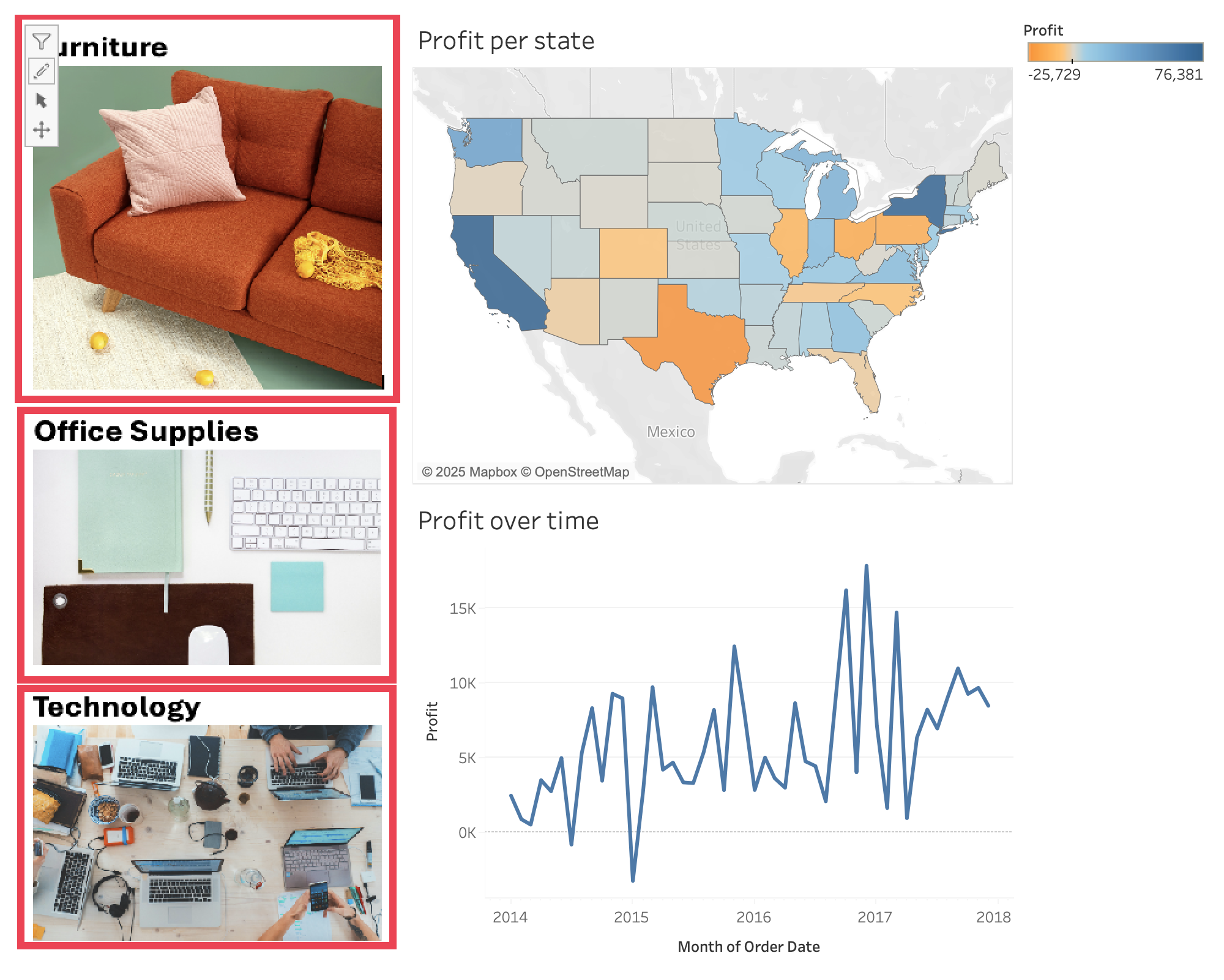 A map shading each state with the total profit