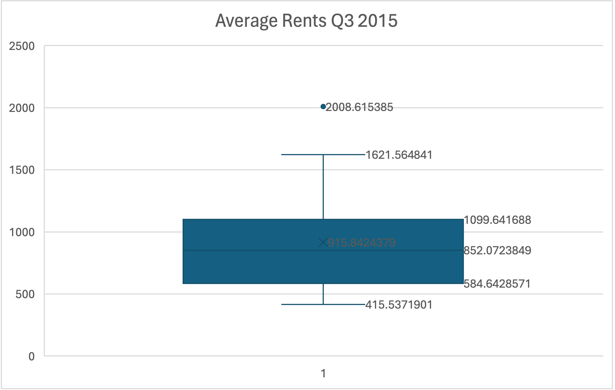 The Excel file below includes average rent prices in a number of places in Colorado in quarter 3 of 2015. Create a box-and-whisker plot for the average rent prices and identify any outliers.