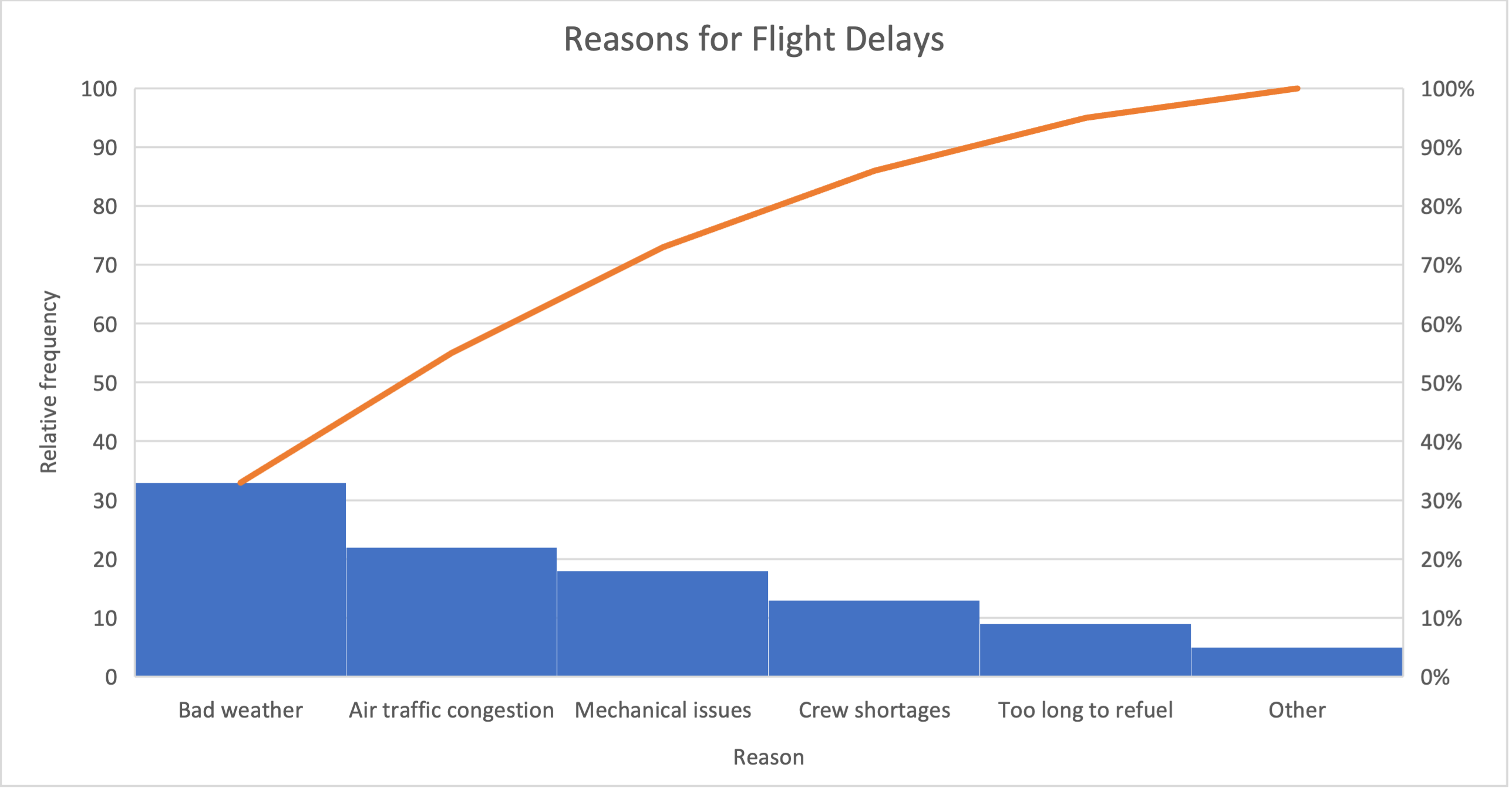 The table in the Excel file below shows an airline companyβs flight delay data. The table shows the reasons for the delays and the relative frequency of each type of delay. Construct a Pareto chart for the data.