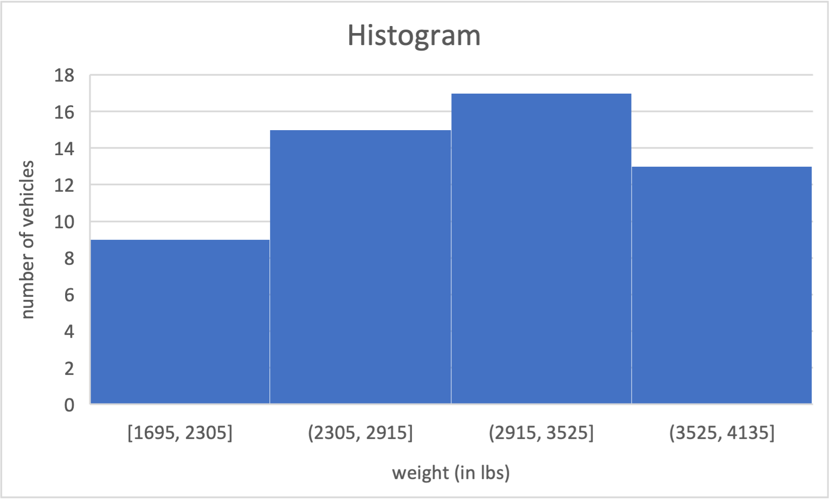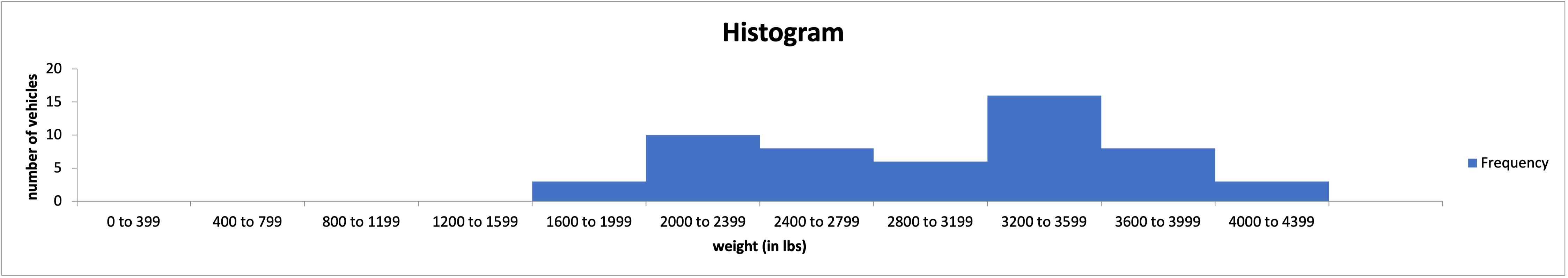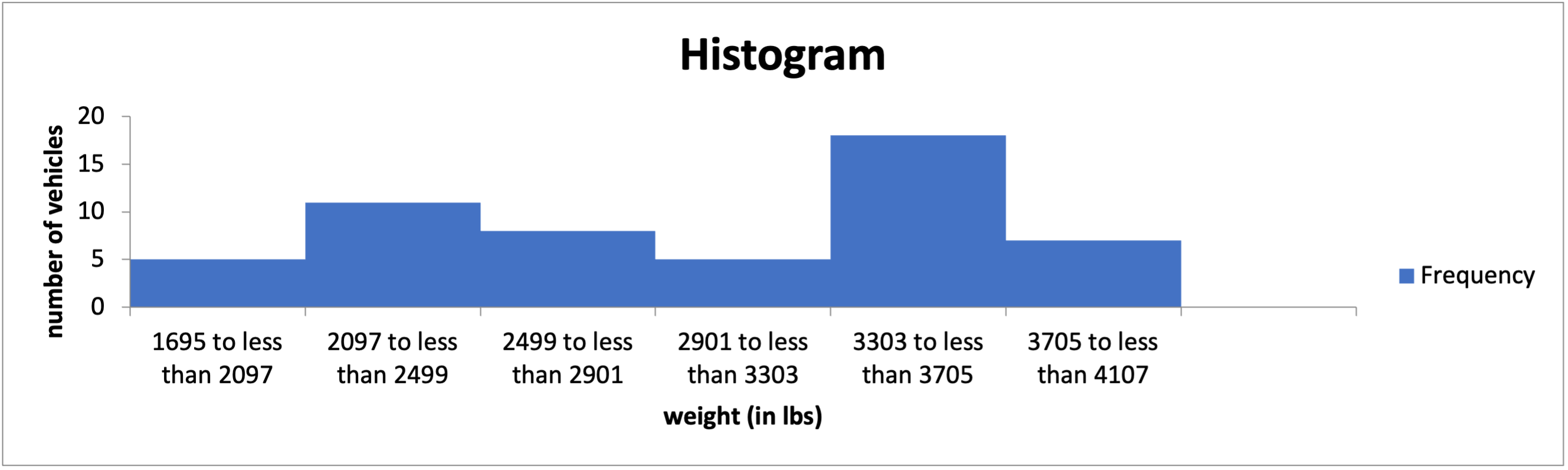 We want to create a histogram using the Data Analysis add-in in Excel. If we use the \(2^k\geq n\) Rule to find the number of bins, which of the following would be a histogram for “weight (in lbs)” in the Excel file below?